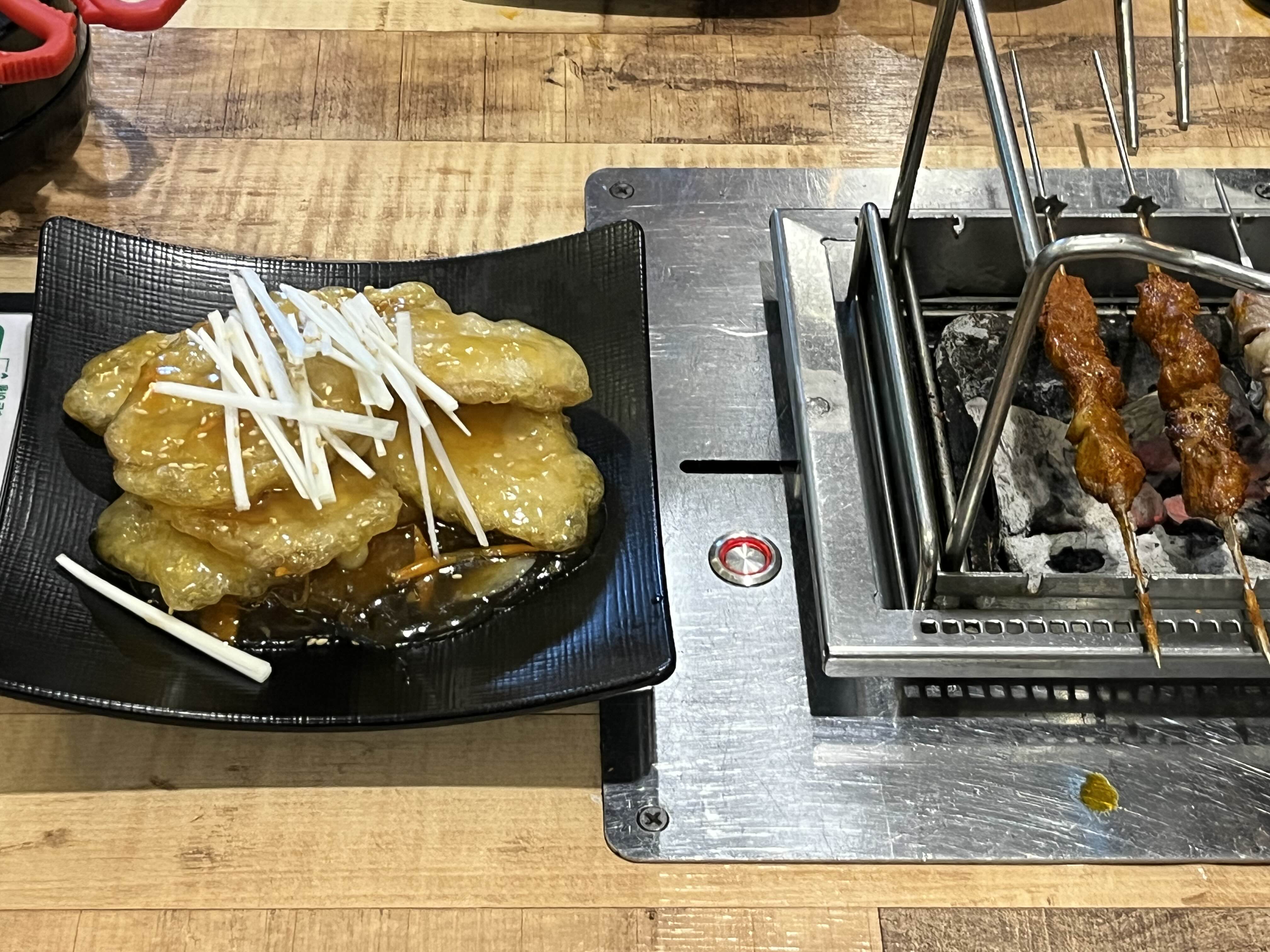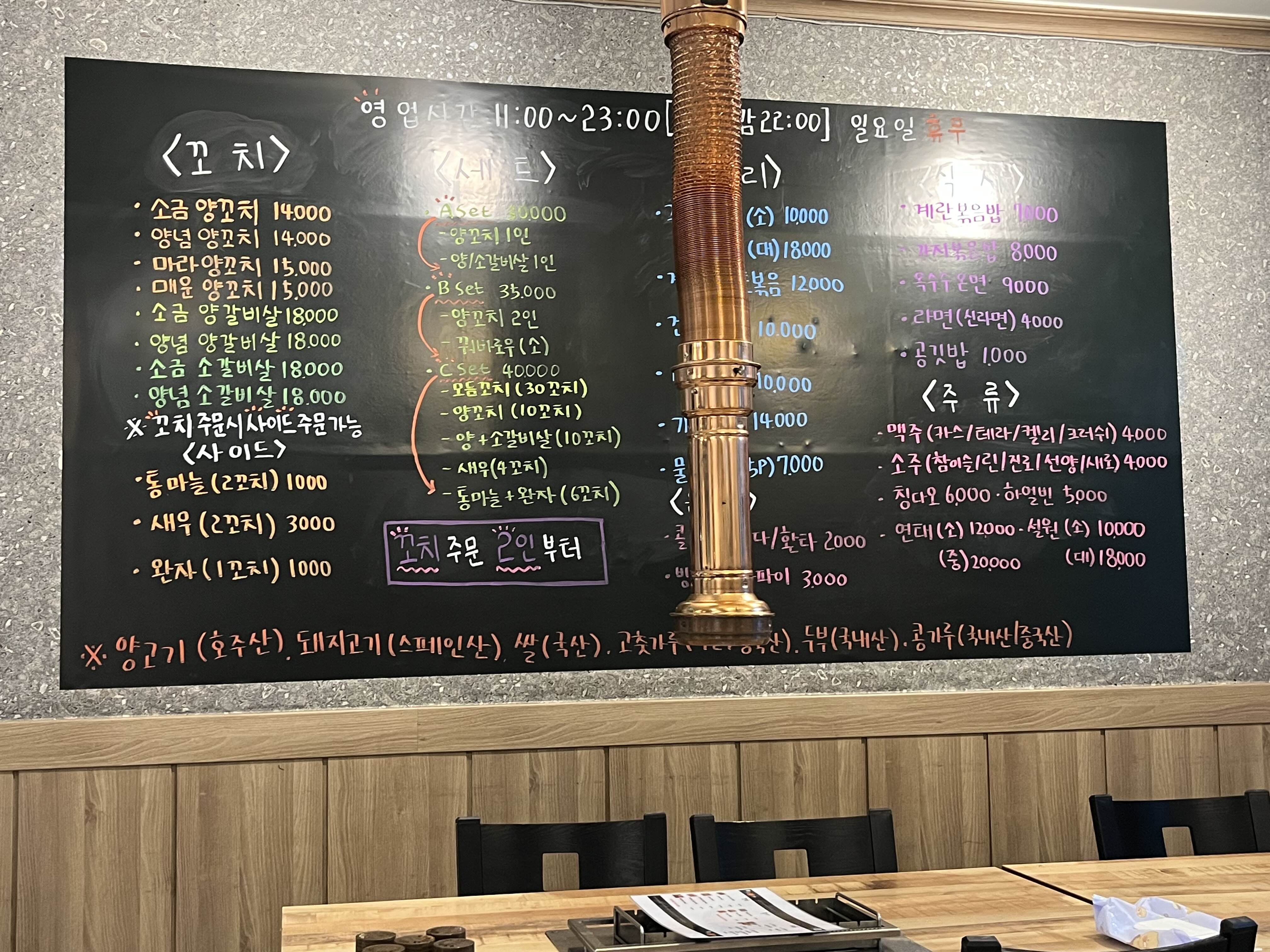 테이블마다 숯불 그릴이 설치되어 있어 양꼬치를 바로 구워 먹을 수 있게 되어 있고, 환풍도 잘 되어 있어 연기 걱정은 크게 없었어요~